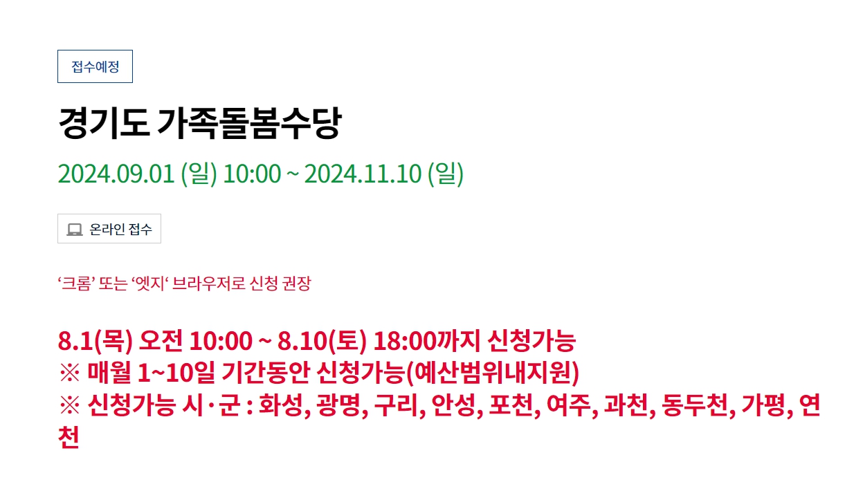 신청대상자 : 경기도 거주 만 24~만 48개월 미만의 영아가 있는 맞벌이 부모 또는 양육공백이 발생한 가정