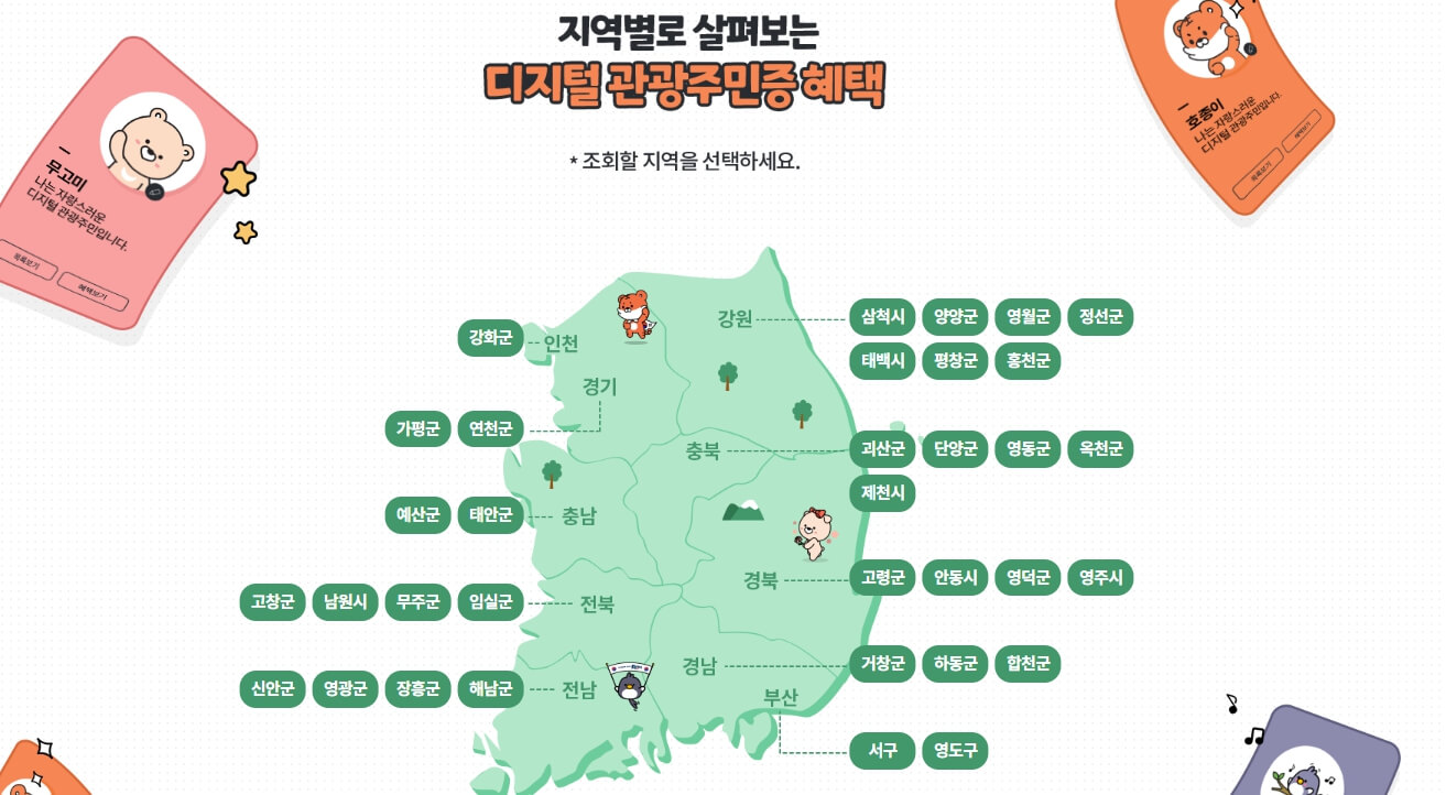 현재 총 34개 지역에 디지털 관광주민증을 발급받고 여행하면 혜택을 받을 수 있습니다.