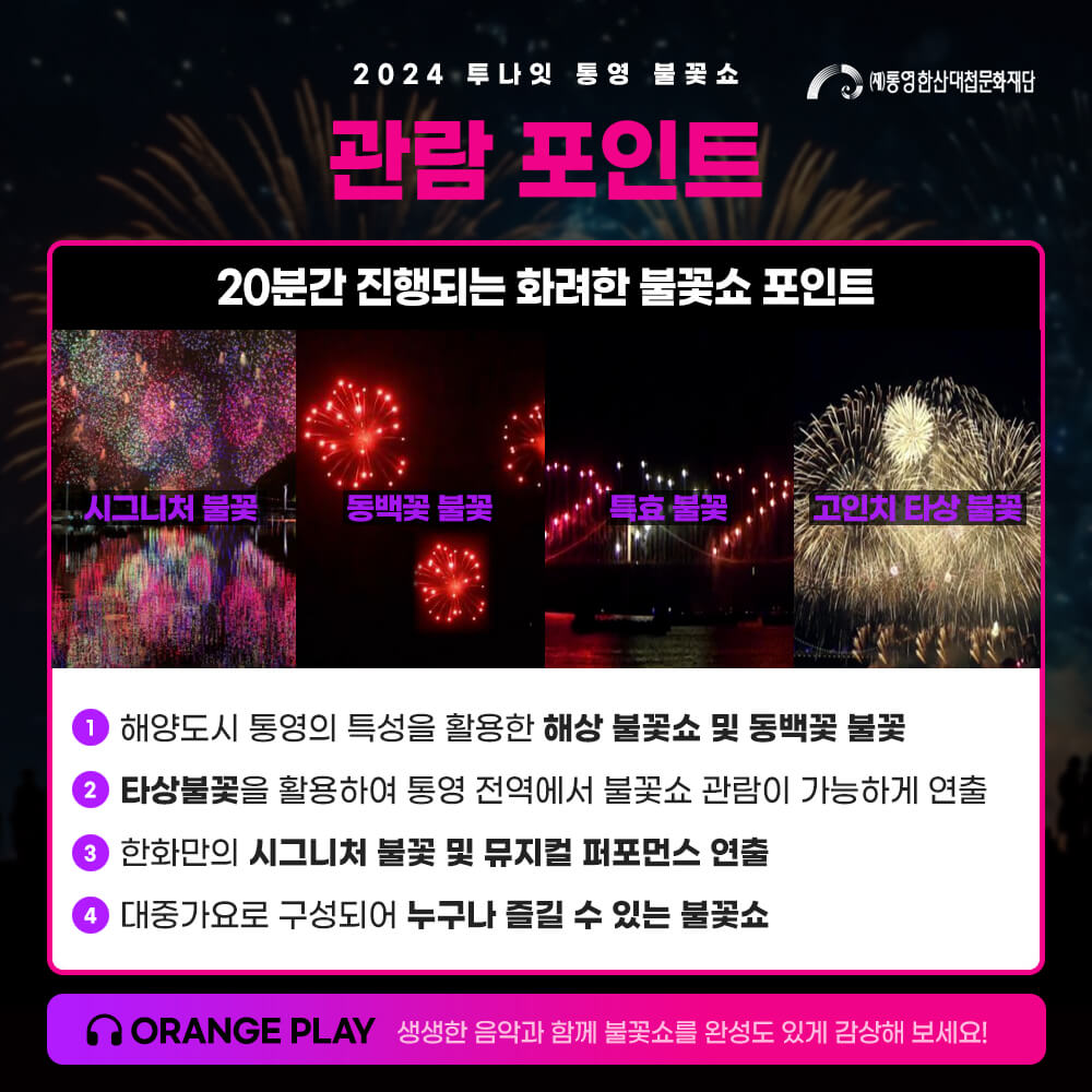 운영 내용 : 해양관광도시의 이점을 활용하여 통영만의 색다른 불꽃쇼가 연출됩니다.