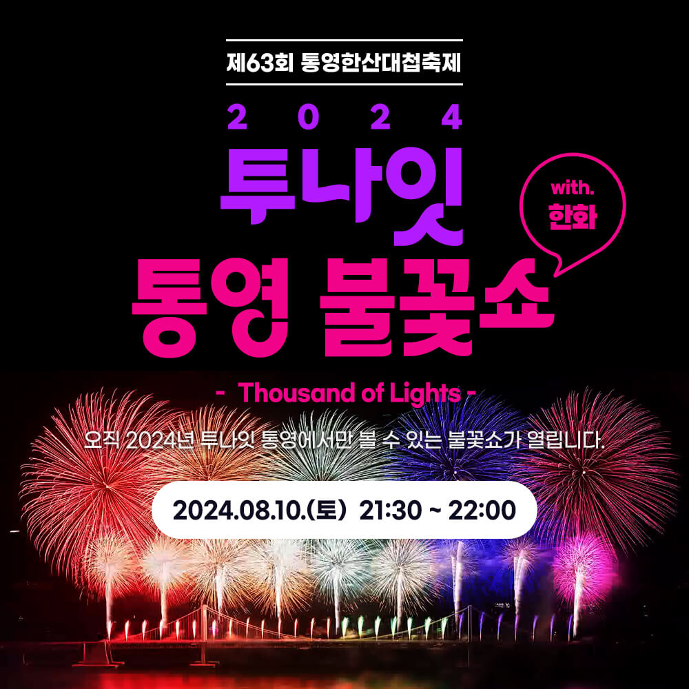 한화에서 주관하는 이번 불꽃축제는 시그니처 불꽃 및 뮤지컬 퍼포먼스가 연출되어 먼 거리에서도 충분히 관람이 가능합니다. 해양도시 통영은 표현하는 재미있는 해상 불꽃쇼는 놓치지 말고 꼭 관람해 보세요.