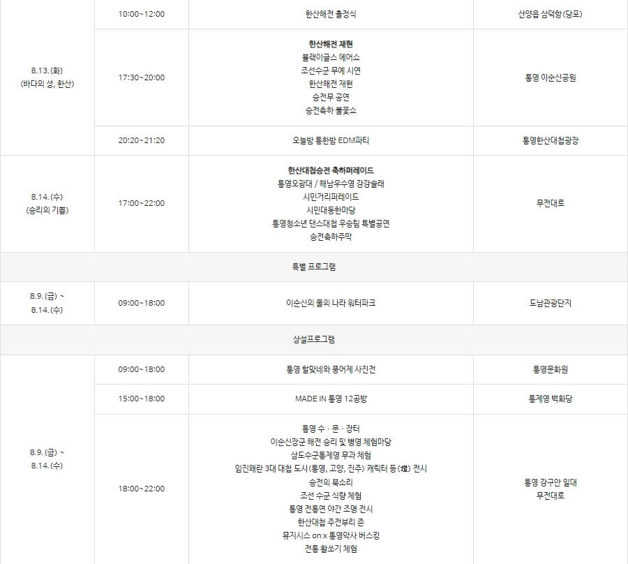 이번 2024년 8월 9일부터 진행되는 통영 한산대첩축제를 가실 계획이 있으신 분들은 위의 내용들은 참고하셔서 좋은 추억과 유익한 시간을 보내고 오셨으면 좋겠습니다.